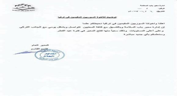 يذكر أن السلطات التركية أصدرت الثلاثاء 30 أيار/مايو 2017 قراراً يقضي بالسماح للسوريين المقيمين في تركيا بقضاء إجازة العيد في سوريا ابتداء من يوم الخميس الأول من حزيران/يونيو المقبل والعودة مجدداً إلى تركيا لغاية 30 أيلول القادم وذلك عبر معبر باب الهوى فقط حسب بيان صدر من المعبر.