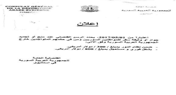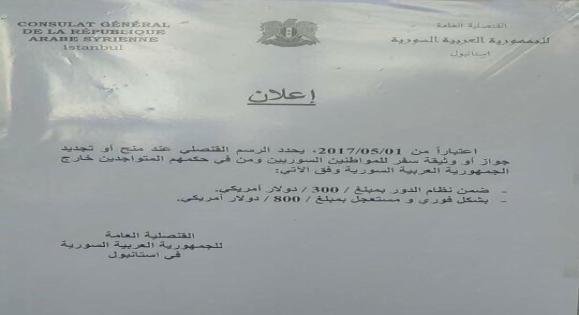 وتناقل ناشطون ومكاتب خدمية صورة عن إعلان نشرته القنصلية في مقرها اليوم، وجاء فيه: “اعتباراً من 1/5/2017، يحدد الرسم القنصلي عند منح أو تجديد جواز أو وثيقة سفر للمواطنين السوريين ومن في حكمهم المتواجدين خارج الجمهورية العربية السورية وفق الآتي: ضمن نظام الدور بمبلغ (300) دولار أمريكي – بشكل فوري ومستعجل بمبلغ (800) دولار أمريكي”.